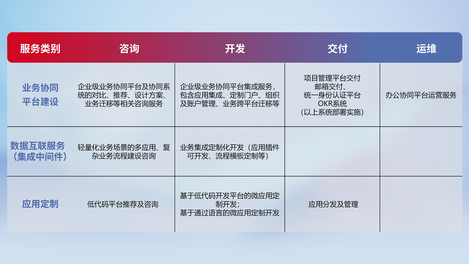 针对钉钉、、、、企微、、、、IDaas等平台级产品提供产品的规划、、、、方案、、、、交付、、、、定制化开发等服务,,,,实现如统一协同办公、、、智能客户服务、、混合会议管理、、、、智能数据查询、、等业务场景,,,,实现数字化转型。。。