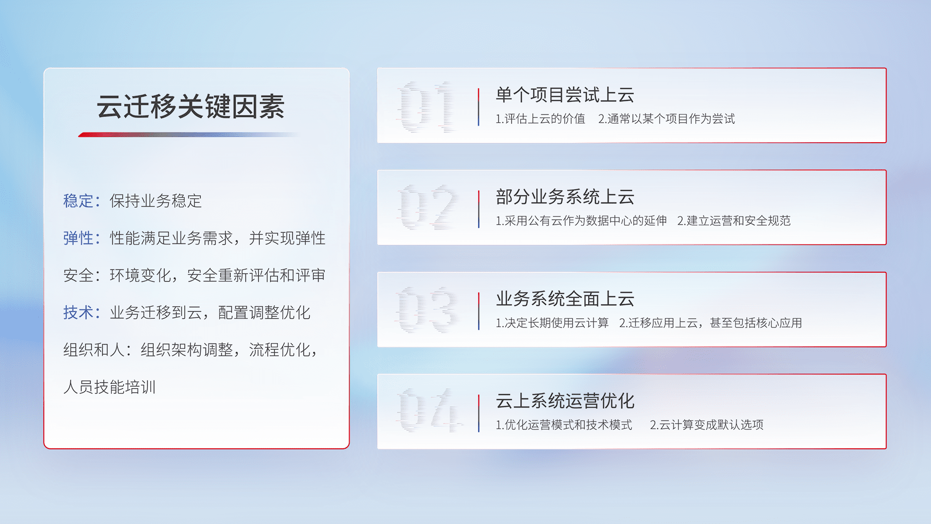 结合实际业务,,,从规划设计、、、云平台选型、、、、云原生改造、、、数据迁移、、、、集成交付,,迁移全过程为客户识别最佳上云路径,,,做好风险识别管理,,,设计网络架构、、、身份权限、、、安全审计合规、、、、操作审计、、日志审计、、、监控告警策略、、、、多站点容灾设计等,,,对云上基础设施进行整体规划,,,,提升IT治理水平,,以满足弹性、、高可用、、高性能的需求。。
