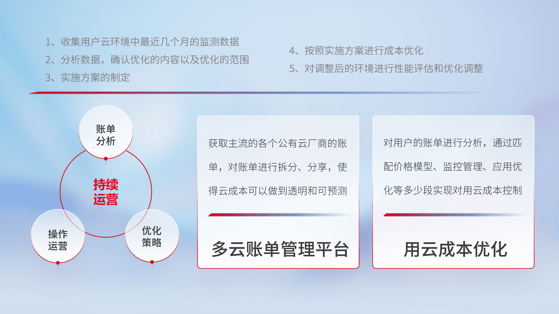 通过多云纳管,,,,以统一的资源数据模型把客户的云资源进行抽象和封装,,,,进而实现对多云资源的统一操作,,保障云资源管理的可靠性、、稳定性与可用性。。量身定制化运维内容,,,,配置、、、、开发运维、、、补丁管理、、、、备份、、监控、、、认证和访问管理、、审计和日常巡检等,,保障在用云过程中的可靠度,,稳定度以及高可用率。。。。