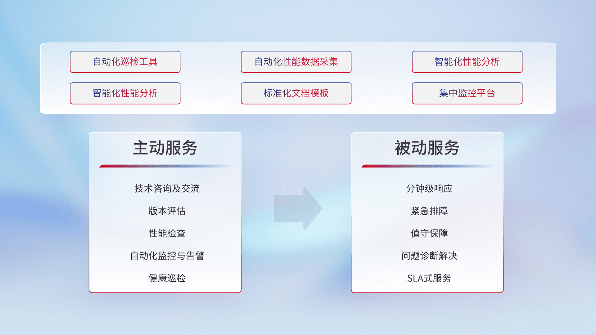 智能化工具和标准化文档,,,保障服务质量,,,,提供主动服务(包含技术咨询、、、、版本评估、、、性能检查、、、自动化监控与告警、、、健康巡检)和被动服务包含(分钟级响应、、紧急排障、、值守保障、、问题诊断解决、、SLA服务)。。。